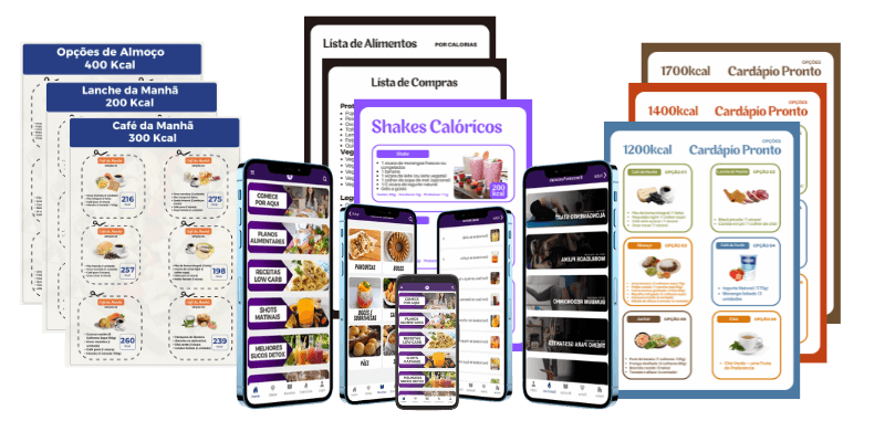 Além do nosso aplicativo super completo você ainda receberá diversas opções de Refeições, Cardápios, Listas de Compras, Alimentos e Calorias e muito mais, tudo pronto e organizado por calorias, tudo prático para imprimir e seguir sua dieta mais facilmente.